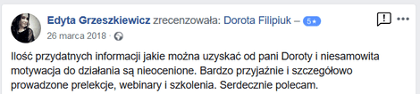 Dorota jest współautorką produktów wspierających proces diagnozy i rozwoju potencjału zdolnych gimnazjalistów, prelegentką na licznych konferencjach i gościem w wielu podcastach. Prowadzi kanał w serwisie YouTube i podcast ,,Efektywność Osobista".